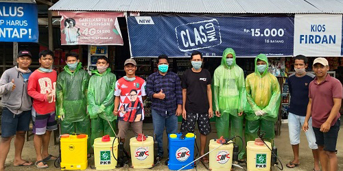 Bukan hanya penyemprotan disinfektan di keliling kampung,Sahabat MUS bersama Sahabat AMURE juga bagi bagi masker ke warga .